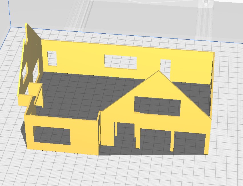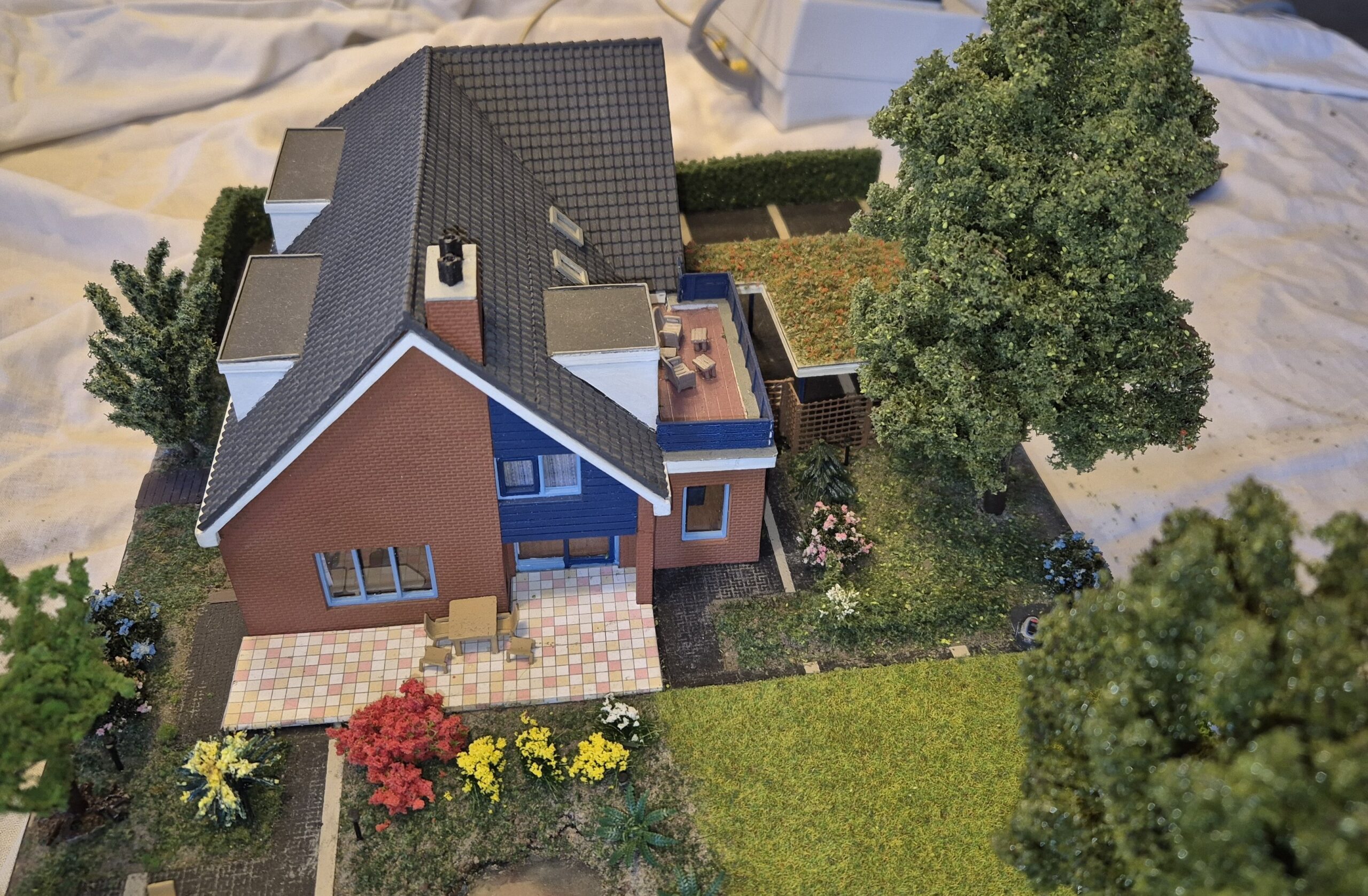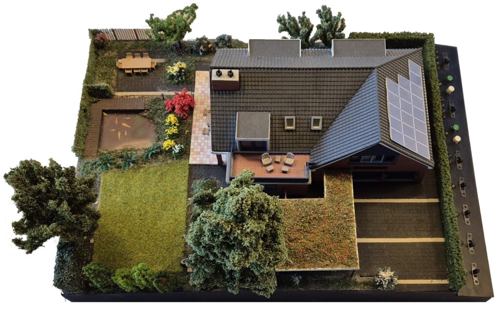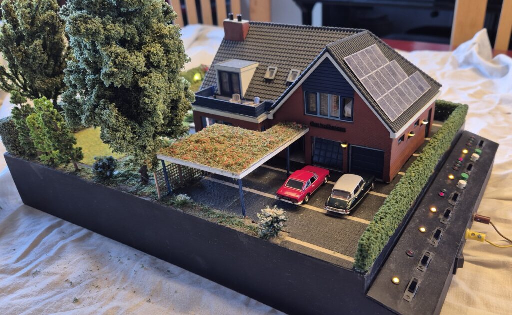 Ik heb ons huis nagebouwd in schaal H0, dat is schaal 1 op 87. De gevels heb ik geprint met de 3D-printer. Het dak bestaat uit standaard dakplaten die je koopt in de treinenwinkel.