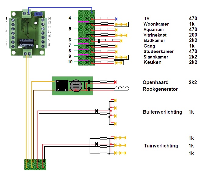 Als je bijvoorbeeld de schakelaar Binnenverlichting naar rechts schuift, dan worden de kamers om de beurt verlicht. Dit wordt geschakeld door een lichtcomputer, de Tams LC-NG-02. Deze stuurt de verlichting van de verschillende kamers volgens een ingesteld dag- en nachtschema. Een gele LED geeft aan dat deze verlichting in werking is.