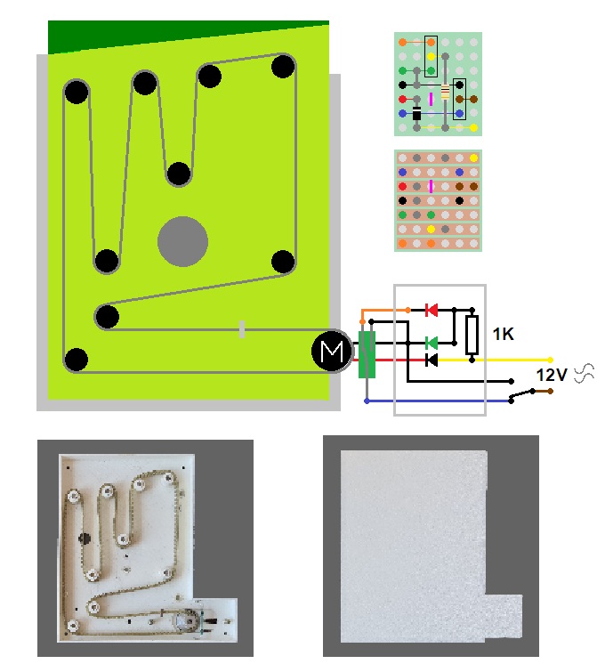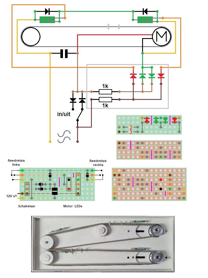 De garagedeuren worden bediend door een servomotor. Om een auto in en uit de garage te laten rijden heb ik nog een speciale aandrijving ontworpen. Ook hier rondlopende riemen met een magneetje. De groene buisjes zijn reedrelais, die schakelen als de magneet ernaast komt. En de betreffende auto wordt meegesleept door de magneten.