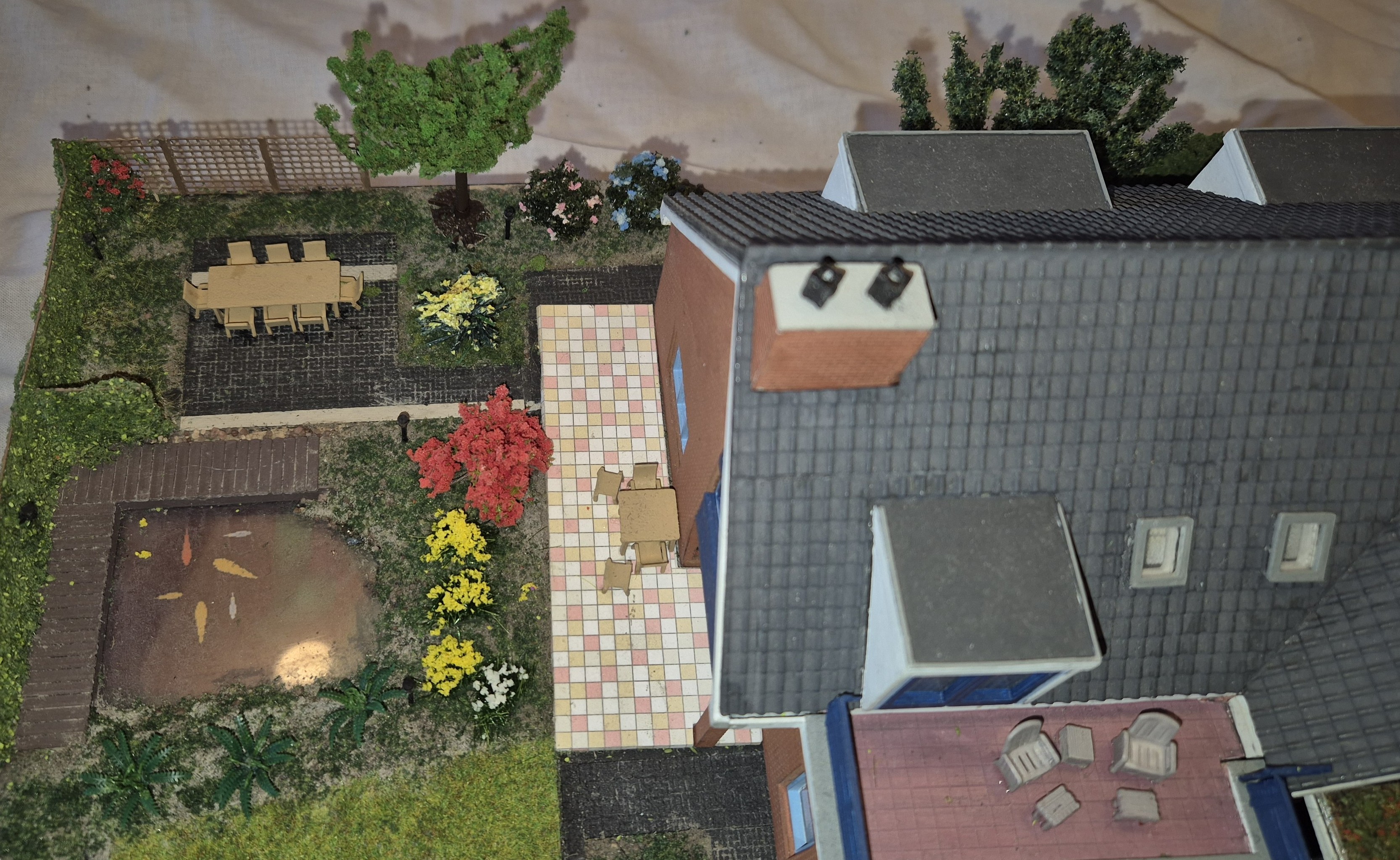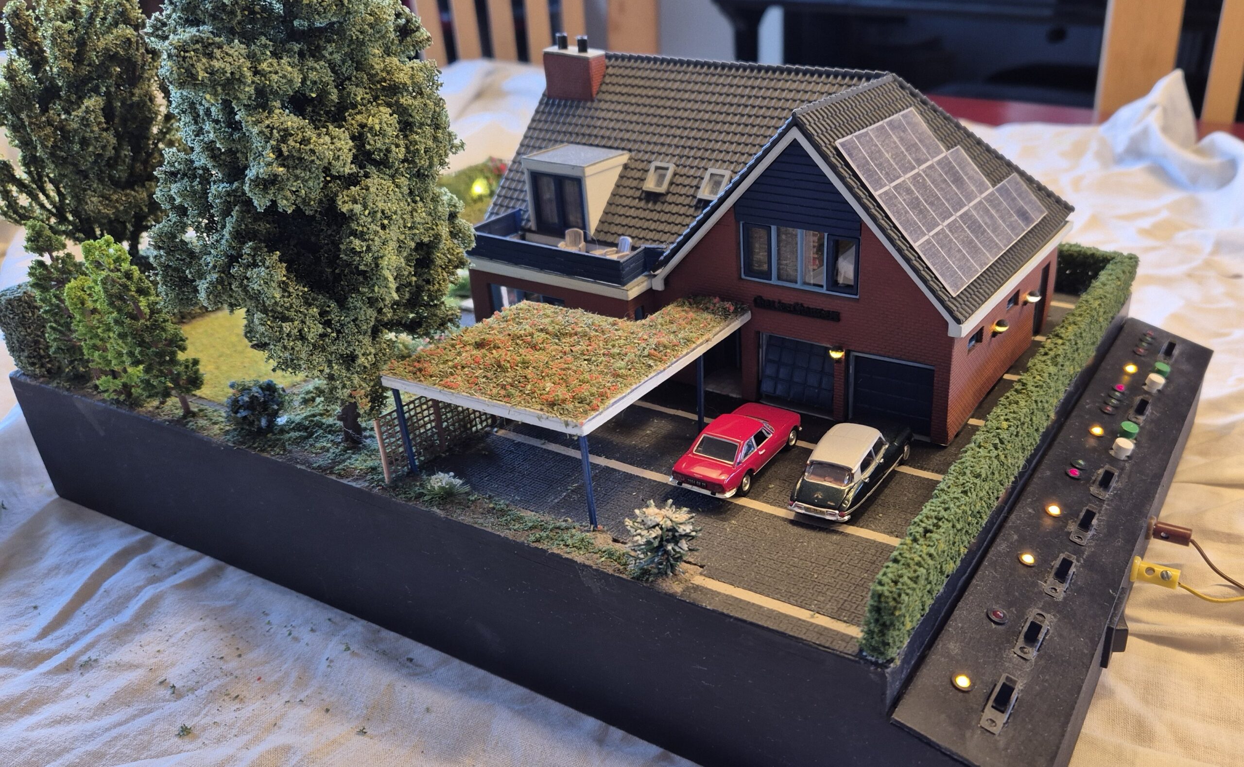 Om voor de hand liggende redenen heet onze maairobot Maaike. Maaike maait elke dag het gras, ook in model. Daarvoor heb ik een speciale aandrijving ontworpen, waarbij een rondlopende riem met een magneetje erop Maaike alle hoeken van het gazon laat zien.
