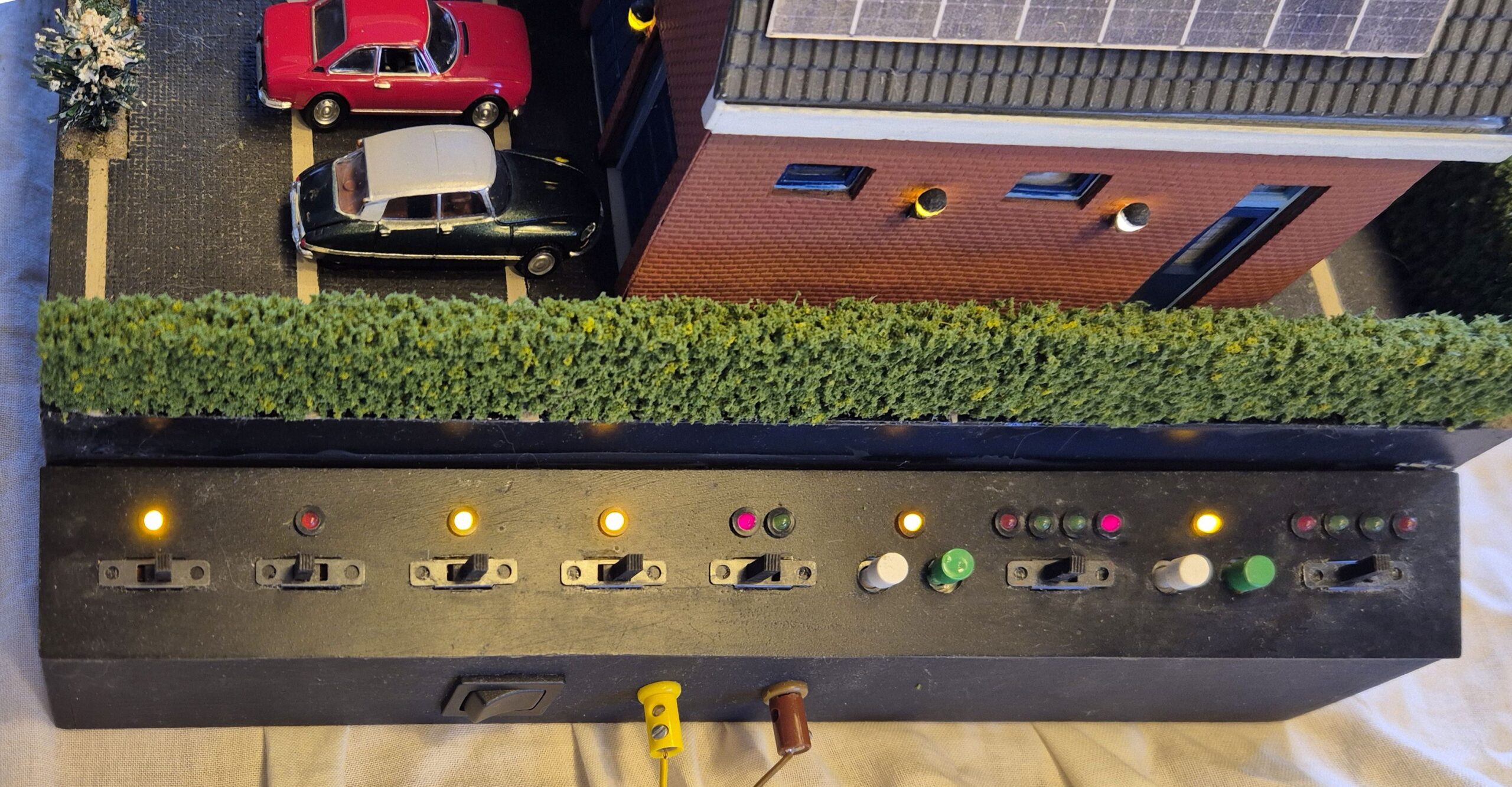 Alle special effects worden bediend met het bedieningspaneel aan de zijkant. Er zijn zes schuifschakelaars om functies aan of uit te zetten en twee druktoetsen op de beide garagedeuren te bedienen. LEDs geven de toestand van een bepaalde functie aan.